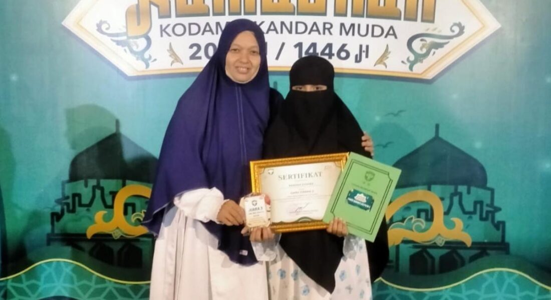 Santriwati kelas I MTs Ma’had Shafwatul Quran (MSQ) Banda Aceh, Raishah Syakirah bersama Ustazah Munira, pembimbing tahfiz Raishah di MSQ foto bersama usai meraih Juara III Tahfiz 5 Juz di ajang Kodim Banda Aceh tahun 2025.Raishah Syakirah, Siswa MTs Ma’had Shafwatul Quran Wakili Khafilah Banda Aceh di MTQ Aceh 2025
